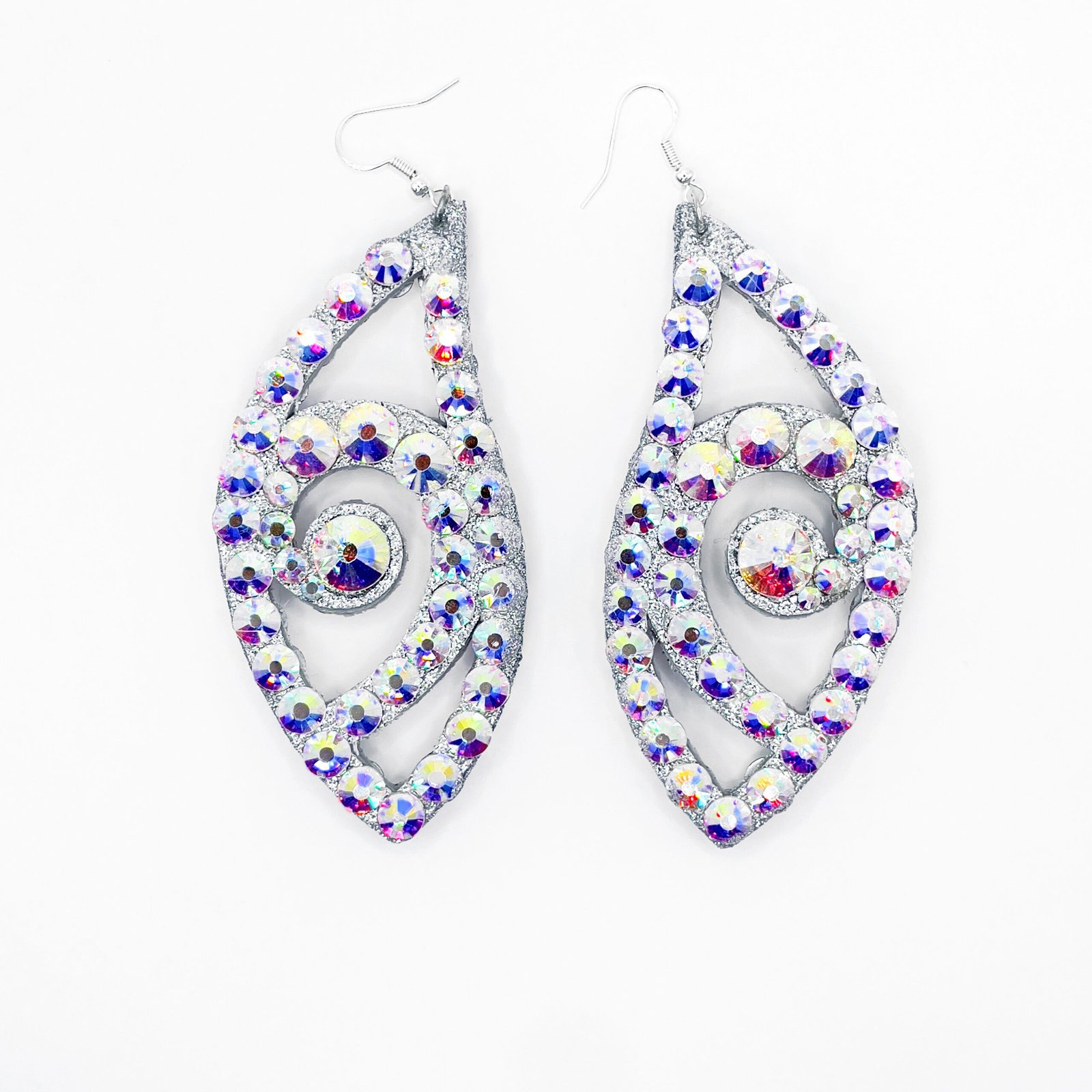 Talisman eye-shaped earrings designed to captivate and protect, featuring a striking centerpiece and shimmering AB rhinestones on both sides for a dazzling, multidimensional sparkle. Lightweight and bold, these handmade earrings reflect light beautifully from every angle, making them perfect for dance, special occasions, or adding a touch of magic to your everyday look.