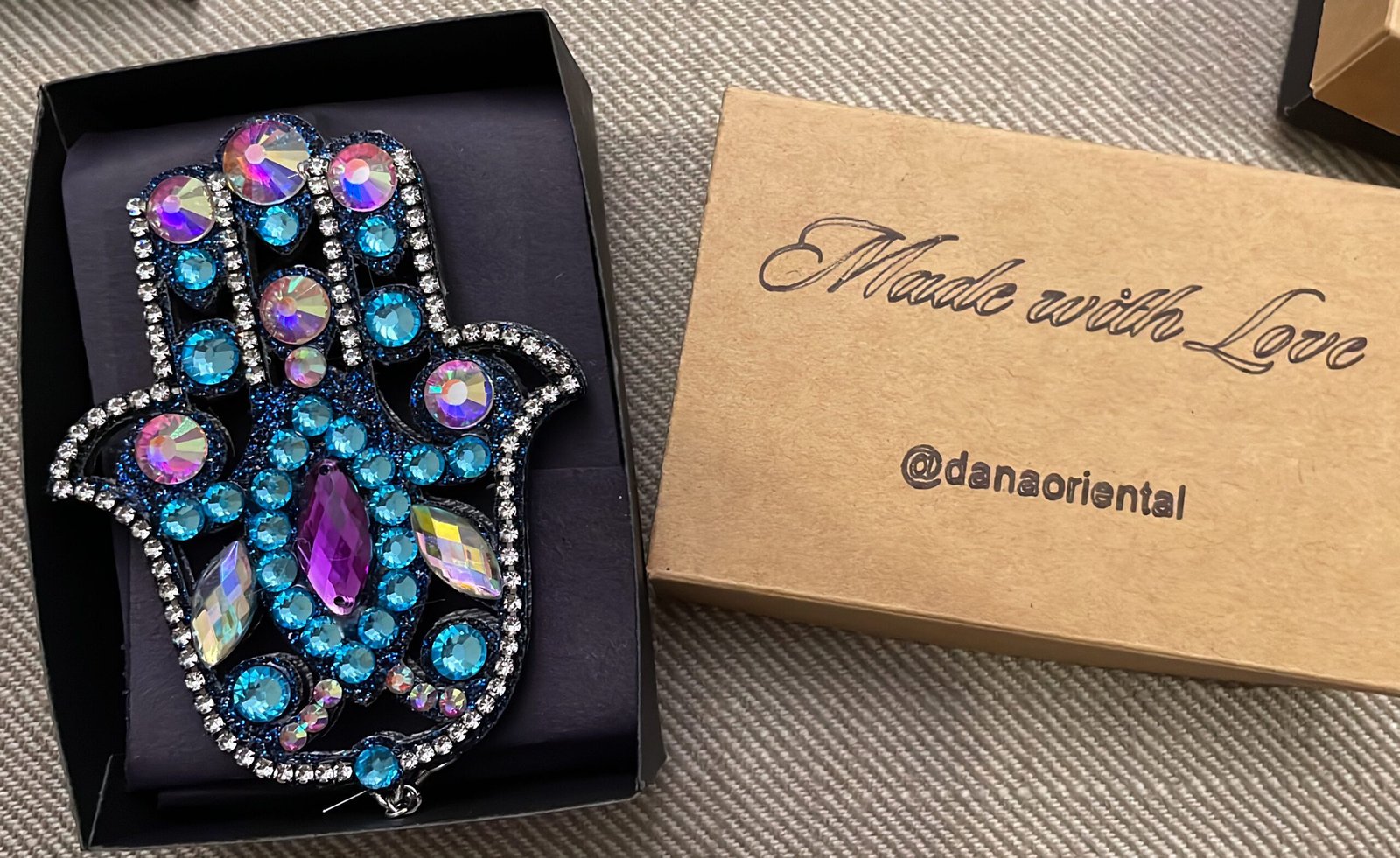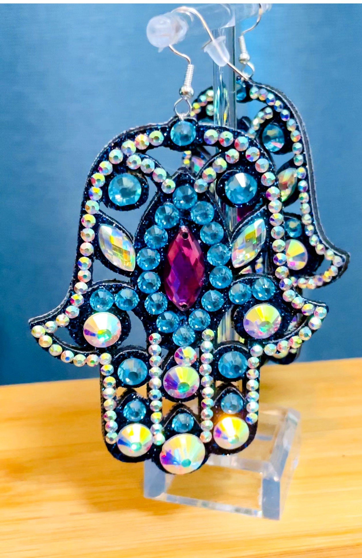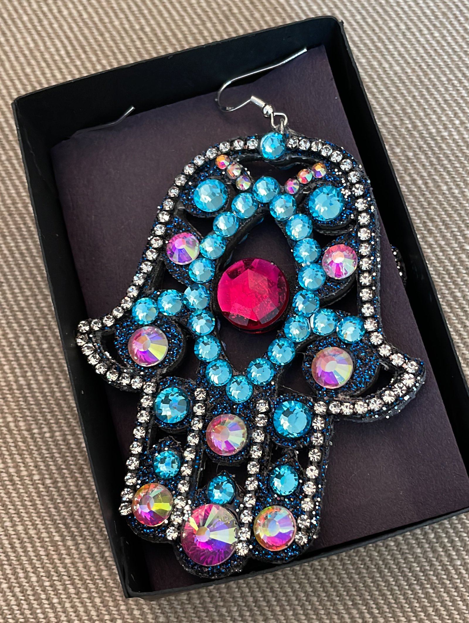 Make a statement with these exquisite hand-made Khamsa or Hamsa earrings, designed to captivate and elevate your style. These earrings offer a beautiful blend of artistry and symbolism, making them perfect for those seeking both beauty and meaning in their accessories. The multi-colored design, adorned with sparkling rhinestones, ensures they will complement a wide array of outfits, making them ideal for casual wear, special occasions, or gifting someone you love.
