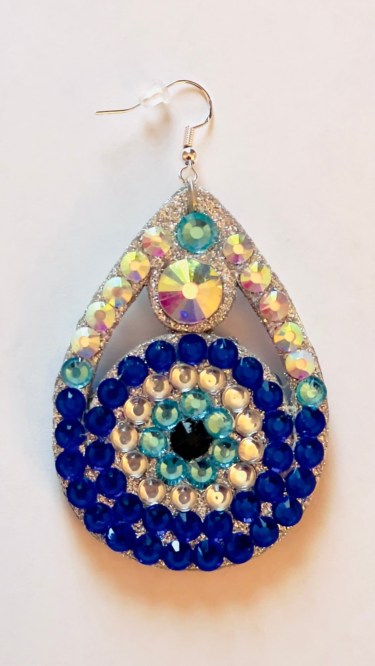 Shimmering with sapphire, aqua, and iridescent crystals, these teardrop earrings are inspired by the protective Evil Eye. Stylish and symbolic, they bring both beauty and positive energy.